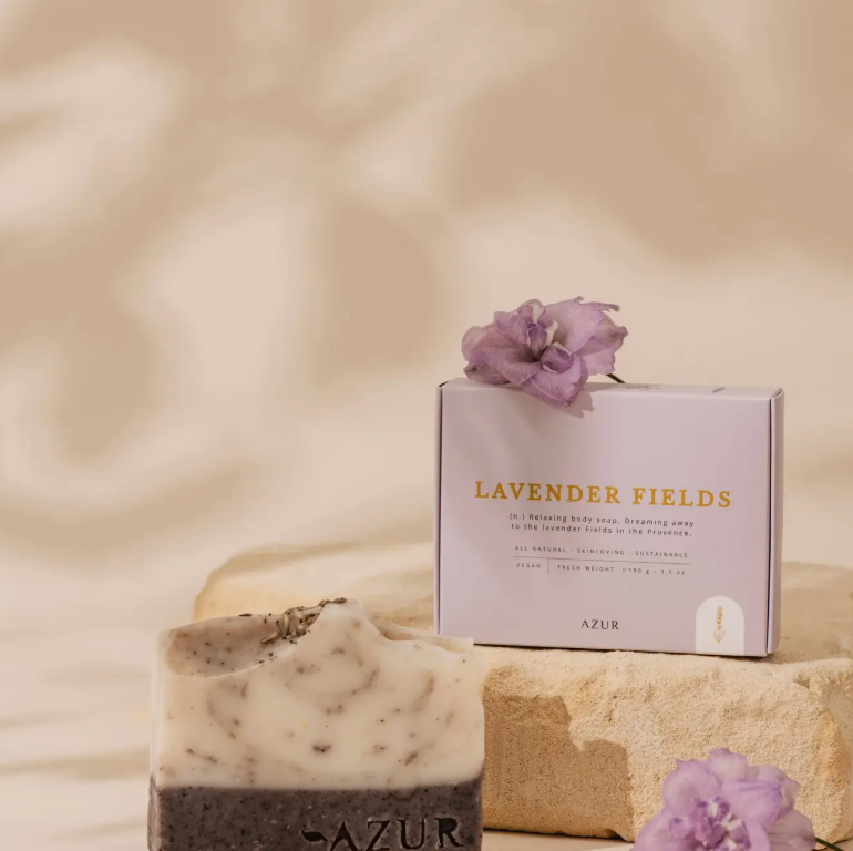 Möchten Sie nach einem langen Tag unter der Dusche entspannen? Lavender Fields darf man sich nicht entgehen lassen! Lassen Sie sich von den wunderschönen Landschaften der Cote d'Azur verzaubern. Lavendel in Kombination mit Rosmarin wirkt beruhigend und beruhigend. Die violette Farbe stammt von der Pflanze Alkanna Tinctoria (Ochsenzungenwurzel). Diese Seife ist ein Favorit jedes Lavendelliebhabers und ist Aromatherapie in ihrer besten Seifenform!